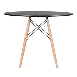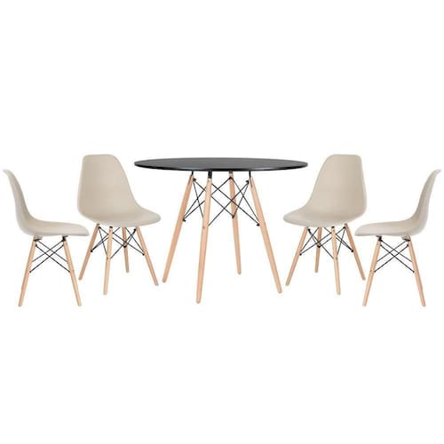 CADEIRAS: Material do assento: Polipropileno - Material da base: Madeira e aço - Altura do encosto: 81 cm - Altura do assento: 43 cm - Largura do assento: 46 cm - Profundidade do assento: 40 cm - Distância entre os pés: 40 cm - Peso suportado: 130 kg. MESA: Material do tampo: MDF laqueado (Laca fosca) - Material da base: Madeira e aço - Altura: 75 cm - Diâmetro: 100 cm.
