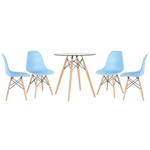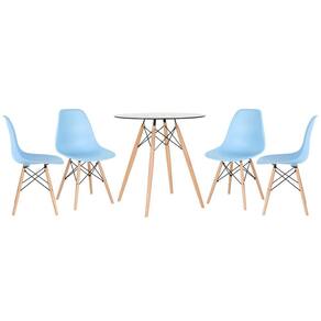 KIT - Mesa Eames com tampo de vidro 70 cm + 4 cadeiras Eiffel DSW Cinza escuro - Azul Claro