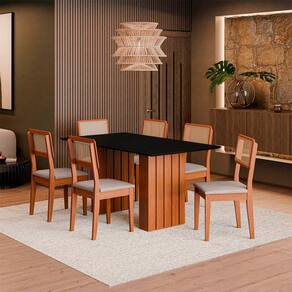 Transforme suas refeições em momentos inesquecíveis com nossa elegante mesa de jantar, acompanhada de seis cadeiras confortáveis.