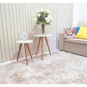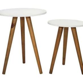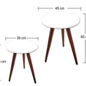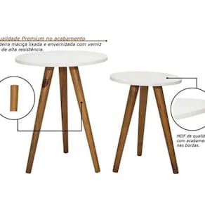 Conteúdo da embalagem: 01 Tampo MDF redondo, diâmetro 45cm, espessura 15mm 01 Tampo MDF redondo, diâmetro 35cm, espessura 15mm 03 Pés de madeira 60cm (formato palito) pintado 03 Pés de madeira 45cm (formato palito) pintado 6 suportes plasticos para rosquear os pés 24 parafusos 4/16