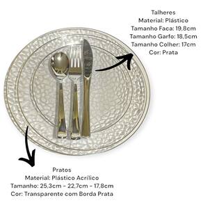 Design Elegante: A borda Prata combina beleza e requinte, tornando cada refeição uma experiência especial. Material Durável: Feitos em acrílico de alta qualidade, os pratos são resistentes, leves e perfeitos para uso interno e externo. Versatilidade: Ideal para servir saladas, entradas, pratos principais ou sobremesas em festas, celebrações e reuniões familiares. Fácil de Limpar: Podem ser lavados à mão, facilitando a limpeza após o uso.