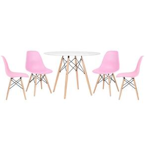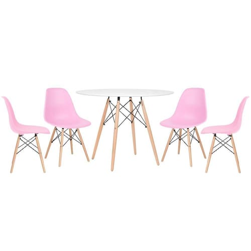 CADEIRAS: Material do assento: Polipropileno - Material da base: Madeira e aço - Altura do encosto: 81 cm - Altura do assento: 43 cm - Largura do assento: 46 cm - Profundidade do assento: 40 cm - Distância entre os pés: 40 cm - Peso suportado: 130 kg. MESA: Material do tampo: MDF laqueado (Laca fosca) - Material da base: Madeira e aço - Altura: 75 cm - Diâmetro: 100 cm.
