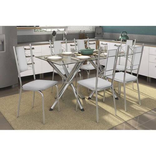 Conjunto: Mesa De Cozinha Volga C/ Tampo De Vidro 150cm + 6 Cadeiras Lisboa Cromada/branco - Kappesberg