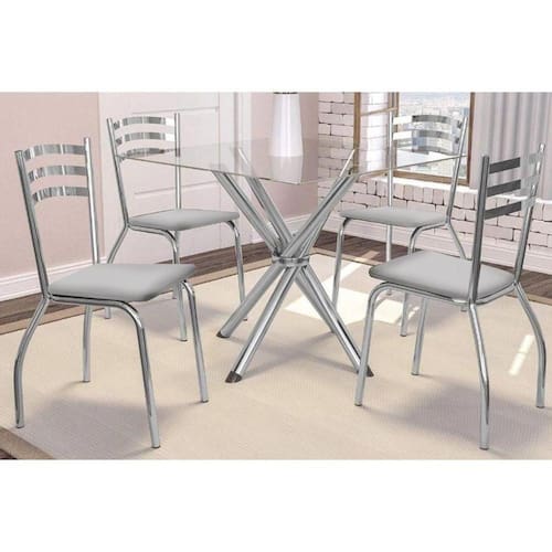 Sala de Jantar Completa Volga c/ Tampo Vidro 90cm + 4 Cadeiras Portugal Cromado/Courano Branco - Kappesberg Abaixo segue os produtos do KIT: Sala de Jantar Completa Volga c/ Tampo Vidro 90cm + 4 Cadeiras Portugal Cromado/Courano Branco - Kappesberg Tampo Mesa Sala de Jantar Vidro TAV9061 Vidro 90x90cm Incolor - Kappesberg