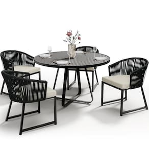 O Kit Mesa Wine Com 04 Cadeiras Bethari é o conjunto ideal para decorar e dispor de conforto e comodidade nos momentos de lazer. O destaque da cadeira vai para o design artesanal confeccionado com corda náutica que traz mais sofisticação e elegância ao ambiente. Ambos com excelente material de alumínio na estrutura essencial para uma boa manutenção duradoura e longínqua do móvel, perfeito para decoração de área externa, mas também dos ambientes internos. Pode ser disposta perto de piscinas, no jardim, cozinha, varanda, e onde mais sua criatividade desejar! Garanta já o seu! Dimensões da Mesa (L x A x P) 78 x 120 x 78 cm Dimensões do Produto (L x A x P) 49,5 x 78 x 55 cm Medidas Internas: Altura do assento: 48 cm Altura do chão ao braço: 66 cm Largura do assento: 50 cm Características: Mesa: Estrutura em alumínio. Acabamento em pintura eletrostática a pó na cor Preto, de alta resistência, sendo indicado também para áreas litorâneas. Ponteiras em polietileno injetadas com borda interna para evitar acúmulo de água. Tampo com frisos decorativos. Cadeira: Estrutura em alumínio. Acabamento em pintura eletrostática a pó na cor Preto, de alta resistência, sendo indicado também para áreas litorâneas. Cordas náuticas produzida com fios de polipropileno na cor Preto. Ponteiras em polietileno injetadas com borda interna para evitar acúmulo de água. Espessura da estrutura: 1,6 mm Suporta até 115 kg. - A tonalidade do produto real poderá ter ligeira variação devido o lote de tecidos. - A limpeza deve ser feita com pano levemente umedecido em água limpa, sem esfregar, não utilizar produtos abrasivos, desengordurantes, álcool ou solvente. - O produto tem aditivo anti enxofre que o torna mais resistente, mas não é recomendada a exposição por tempo indefinido ao sol, chuva, sereno e maresia. - A exposição prolongada ao sol ou maresia, pode causar desbotamento precoce da corda náutica. Observações importantes: - Produto para uso em ambiente interno e externo, não devendo ficar exposto diretamente ao sol, calor e umidade excessivos. - Pode haver alguma diferença de tonalidade entre a imagem e o produto real, por conta do tratamento de imagens e a calibração de cores do seu monitor. - As imagens são meramente ilustrativas, não acompanham objetos de decoração e eletrônicos. - Ao receber a mercadoria, o cliente deve verificar as condições da embalagem, caso haja alguma não assine o de . - Montagem, desmontagem e outras instalações serão de responsabilidade do cliente. Não nos responsabilizamos, no ato da , por subir escadas/elevadores ou pelo por guincho em apartamentos. Eventuais despesas são de responsabilidade do comprador. - Confira as dimensões do produto e certifique-se de que passará normalmente por supostos elevadores, portas, escadas e/ou corredores de sua residência. NA