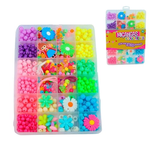 KIT Miçangas Joalheria com Organizador - Ideal para montar bijuterias artesanais infantis, como colares, pulseiras, gargantilhas e até tornozeleiras;\n- Acompanha um organizador e uma variedades de miçangas de plástico e linhas;\nEspecificações:\nMarca : ARK BRASIL\nTipo de material : Plástico\nCores ou Estampa : Colorido\nDimensões do Produto : 19 X 13,5 X 2 CM\nDimensões da Embalagem : 19 X 13,5 X 2 CM\nPeso Bruto (Gramas) : 0.191 Marca: Não Informado