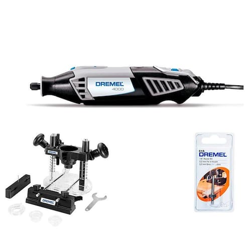 Kit Micro Retifica Dremel 4000 220V + Suporte Tupia de Imersao 335 + Fresa 615 para Borda 1/8 Kit completo para Utilizar a Micro Retifica como uma Tupia de Imersão Micro Retífica DREMEL 4000 220V - SOLO F0134000GB: Ferramenta Multifuncional Rotativa Para Trabalhar Com Máxima Precisão e Praticidade; Ideal Para Lixar, Cortar, Limpar, Polir, Esculpir, Gravar, Esmerilhar, Afiar, Fresar E Furar; Gravar e Mais. Diversas Aplicações em Uma Só Máquina Para Você, Artesão ou Instalador, Ter de Um Resultado Impecável; Pode Ser Aplicada em Materiais Como Vidro, Madeira, Metal, Plástico, Fibra de Vidro, Cerâmica, Alvenaria, Drywall, Azulejo, Papelão e Eva; Verdadeiro Coringa Para Quaisquer Imprevistos nos Trabalhos; Botão Trava/Destrava Para Troca Rápida de Acessórios; Botão Liga/Desliga Independente do Botão de Controle de Velocidade; Corpo Emborrachado Ergonômico Para Maior Conforto e Controle Nas Operações; de Velocidade Variável Para Maior Versatilidade, Com Controle Total Para Máxima Precisão; Constante Eletrônico no Motor, Mantém o Torque em Baixa Velocidade; Motor de Alto Desempenho Para Máxima Performance a Todas as Velocidades. Especificações Técnicas Potência: 175W Voltagem: 220V Rotação RPM: 5.000 - 35.000 / min Torque Constante do Motor Velocidade Variável Sistema de Mudança de Acessórios EZ Twist tm - Para Troca Rápida Dimensões CxLxA : 284 x 231 x 243mm Peso: 2,5Kg Dimensões: 260 x 390 x 99mm Suporte para Tupia Dremel - 335 - 26150335JA: Guias de borda e de corte redondo incluidas Topos com duas profundidades- base transparente Corta circulos precisos e para lelos a qualquer borda Acabamento decorativo Fresa para Borda com guia 3,2 mm 615 - 2615000615 - DREMEL: Descrição: Fresa de arredondamento de cantos Dremel TRIO para fresagem em madeira e outros materiais macios. Acessório dedicado para uso exclusivo com a Dremel TRIO. Diâmetro do encabadouro 4,8mm. Diâmetro de trabalho 9,5mm. Superfícies Recomendadas: Madeira dura, madeira macia,borracha, plastico, plexiglas, carvão. Itens Inclusos no Kit: 01 - Micro Retífica DREMEL 4000 220V ; 01 - Suporte para Tupia Dremel - 335 - 26150335JA; 01 - Fresa para Borda com guia 3,2 mm 615 - 2615000615 - DREMEL. Imagem Meramente Ilustrativa