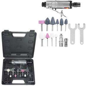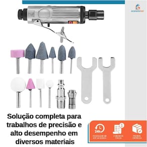 Kit Inclui: Mini Esmeril: Leve e potente, ideal para cortes, lixamentos e polimentos em áreas de difícil acesso. Conector de Ar Rosca 1/4 NPT : Compatibilidade com diversos compressores de ar para sua comodidade. Mandril 1/8 3mm : Permite a utilização de uma variedade de acessórios para atender às suas necessidades específicas. 2 Chaves Fixas 17mm e 14mm : Facilitam a troca de acessórios e garantem um ajuste preciso. 5 Pontas Montadas 1/8 3mm e 5 Pontas Montadas 1/4 6mm : Ampla gama de opções para diferentes aplicações, desde trabalhos delicados até remoção de material. Maleta Plástica: Armazenamento seguro e organizado para todas as peças do kit.