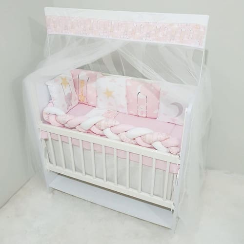 Contém 1 Cabeceira 27 cm x 27 cm 4 Almofadas Laterais 27 cm x 27 cm 1 Trança Lateral 90 cm X 12 cm 1 Edredom 95 cm x 53 cm 1 Lençol de Cima 90 cm x 60cm 1 Lençol de Baixo 88 cm x 38 cm 1 Fronha 35 cm x 28cm 1 Bando 90 cm x 15 cm 1 Mosquiteiro92 cm x 1,50 cm