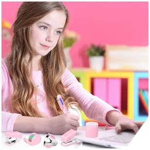 O kit mini escritório auroray rosa reúne em um único conjunto grampeador, furador, apontador, extrator de grampos, tesoura, dispenser de fita, régua, bloco adesivo, caneta, clips, binder clips, percevejos e grampos, formando um kit compacto de itens básicos para estudo e rotinas de escritório. As peças combinam componentes em metal e plástico com acabamento em tom rosa uniforme, criando um visual coordenado para mesa de trabalho ou área de estudo. O formato reduzido facilita o transporte em mochilas, bolsas ou pastas, sendo adequado para estudantes, profissionais em deslocamento e uso em espaços com pouco espaço disponível.