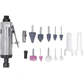 Acessórios Inclusos: O kit acompanha 1 mini esmerilhadeira, 10 pontas montadas para diversas aplicações, 2 chaves para abertura e troca da pinça, pinça 1/4 e pinça 1/8, além de 1 nipple para conexão de ar.
