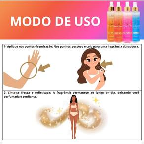 Aplique diretamente sobre o corpo, evitando a região dos olhos. Reaplique conforme desejar ao longo do dia para manter a refrescância e o perfume.