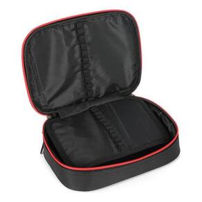 Estojo super resistente e espaçoso, com capacidade máxima de 100 lápis. Ele possui dois compartimentos separados por uma divisória e vem com 20 elásticos, 10 de cada lado, para prender lápis e canetas em separado.