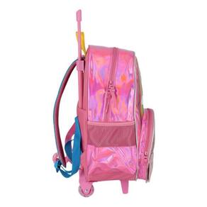 Esse lindo kit escolar arco íris metalizado vai fazer sucesso entre a garotada. Esse modelo conta com 1 compartimento principal e dois bolsos laterais para colocar a garrafa. Possui 2 rodinhas de silicone e 2 apoiadores frontais para mantê-la em pé.
