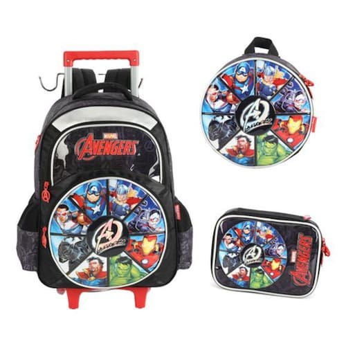 Esse lindo kit escolar avengers vai fazer sucesso entre a garotada. Esse modelo conta com 3 compartimentos e dois bolsos laterais para colocar a garrafa. Possui 2 rodinhas de silicone e 2 apoiadores frontais para mantê-la em pé.