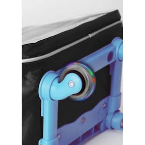 O carrinho é feito em alumínio e as quatro rodinhas possuem giro 360 e LED, proporcionado leveza e facilidade ao transporte. O puxador é em forma de T, com botão para regular a altura. Ela também pode ser usada nas costas pois possui alças ajustáveis e macias que se adaptam ao corpo. Vem com alça de mão fixa. Além de Contar com a novidade desse ano, o borrachão na parte da base que proporciona mais durabilidade e proteção do produto.