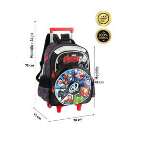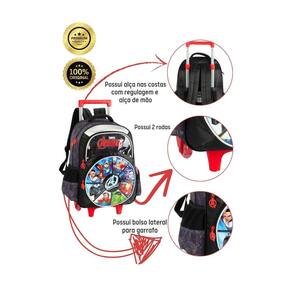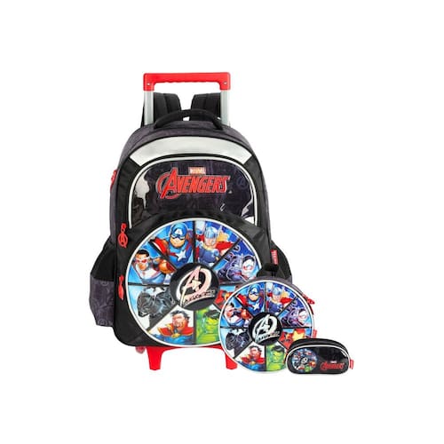 Kit escolar mochila com rodas+lancheira térmica+estojo triplo avengers mochila rodas: Possui rodas e alças de costas Confeccionada em poliéster Possui 3 compartimentos espaçosos Fechamento em zíper Dois bolsos laterais telados Etiqueta de identificação na parte traseira Puxadores personalizados
