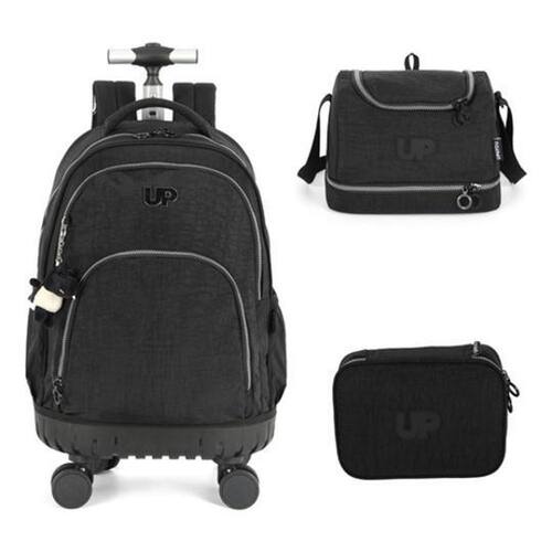 Kit Escolar Mochila com Rodinhas Duplas giros 360º + Lancheira Térmica e Estojo 100 Pens, marca Up4you, com Porta Notebook. A mochila é feita Crinkle e tem design exclusivo e diferenciado da marca Up4you. O carrinho é feito em alumínio e as quatro rodinhas possuem giro 360, proporcionado leveza e facilidade ao transporte. O puxador é em forma de T, com botão para regular a altura. Ela também pode ser Utilizado nas costas pois possui alças ajustáveis e macias que se adaptam ao corpo. Vem com alça de mão fixa. Além de Contar com a novidade desse ano, o borrachão na parte da base que proporciona mais durabilidade e proteção do produto. A mochila é bastante espaçosa, perfeita para acomodar livros, ficheiros, cadernos e agenda. Na parte interna são duas divisões, com um compartimento para notebook. Os 3 compartimentos são fechados por zíper. - Carrinho em alumínio com puxador e rodinhas; - Logo em Metal Resinado UP - Alça de costas acolchoada; - Alça de mão reforçada; - Zíper Trator - Mochila super leve e resistente; - Acompanha Chaveiro Dinossauro Up4you. - Rodinhas Duplas Giros 360 - Medidas: 46x34x22 cm AxLxP Estojo em Crinkle super resistente e espaçoso, com capacidade máxima de 100 lápis. Ele possui dois compartimentos separados por uma divisória e vem com 20 elásticos, 10 de cada lado, para prender lápis e canetas em separado. Ideal para crianças e adolescentes levarem à escola e manterem os materiais separados e em ordem. Medida: 6x15x21 cm AxLxC Bolsa Lancheira Térmica em Crinkle, super-resistente, com 2 compartimentos, da marca Up4you. A lancheira é bastante espaçosa, perfeita para colocar potes com refeições e sanduíches, garrafas de água ou suco e frutas. Ideal para crianças e adolescentes levarem à escola ou adultos levarem para o trabalho, academia ou passeios ao ar livre. A lancheira contém uma alça regulável, que pode ser ajustada ou retirada quando necessário. Possui fechamento em zíper tratorado e elástico na parte de trás, para acoplar em mochilas de carrinho. - Lancheira térmica super leve e resistente. - Alça regulável, com opção de retirada. - Fechamento em zíper. - Medidas: 26x17x20 cm AxCxL - Não acompanha potinho e garrafa. de 6 meses contra defeito de fabricação Dicas e Cuidados; Proteja os objetos pontiagudos ou cortantes evitando o contato direto com o produto. Guarde o produto e um local seco, fresco e arejado, para evitar a proliferação de fungos que podem danificar o produto. Para Limpeza, use apenas água morna e sabão neutro nas partes metálicas somente uma flanela seca. Nunca aplique produtos abrasivos, solventes ou quaisquer agentes químicos. Para secagem, Utilize apenas pano seco. Não exponha ao sol e altas temperaturas por um período de tempo prolongado. Apare sempre os fios soltos do tecido, para que eles não se prendam no zíper. Duvida Faça-nos uma pergunta :