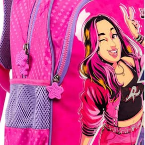 Arte supercolorida e vibrante: a frente da mochila exibe uma arte exclusiva e cheia de personalidade das duas influenciadoras, capturando toda a sua essência. Frente em pvc com relevo e acabamento em glitter: um efeito brilhoso que chama a atenção e adiciona um toque mágico ao design. Estampa exclusiva e zíper duas cores: cada elemento foi pensado para criar um produto único e com a cara das influencers. Conforto garantido: as alças de costas acolchoadas, ajustáveis e com estampa de estrelas oferecem o máximo de conforto durante o uso, distribuindo o peso de forma equilibrada. Resistência e estabilidade: costas e base estruturadas, com um acabamento reforçado, garantem maior durabilidade e estabilidade, protegendo seus materiais. Material de alta qualidade: confeccionada em poliéster resistente, é feita para durar e suportar o ritmo do dia a dia escolar. Dois compartimentos com zíper: oferecem espaço amplo e facilitam a organização de livros, cadernos, estojos e outros materiais escolares. Bolsos laterais em mesh e poliéster: perfeitos para armazenar garrafas de água, guarda-chuva ou itens menores que precisam de acesso rápido. Puxadores emborrachados personalizados e zíper de alta qualidade: garantem um fechamento suave, seguro e um toque especial. Tamanho aproximado: 30cm largura x 40cm altura x 15cm profundidade