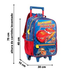 Medidas da mochila carros relâmpago mcqueen : Largura: 30 cm Altura: 40 cm Profundidade: 15 cm Peso 0,8 kg 18 litros ======================================================== Lancheira carros relâmpago mcqueen