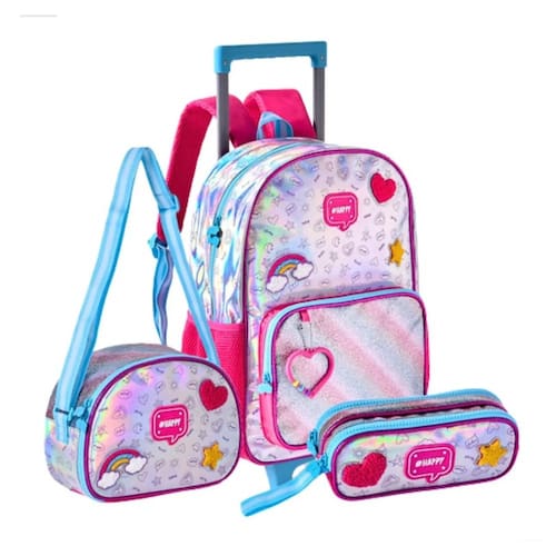 Marca: Clio Style; Rodas retráteis; Zíperes personalizados; Lancheira térmica; Alças reguláveis; Leve e fácil de transportar.