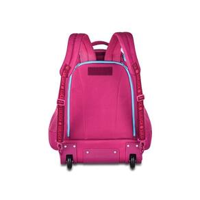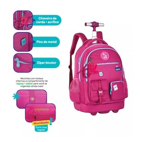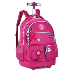 A Mochila de Rodinha Oficial da Luluca é confeccionada em nylon com acabamento em matelassê com patches de borracha, metal e tecido, garantindo durabilidade e elegância. Cadarços logados acetinados, pins de metal e etiqueta de borracha, reforçando o design exclusivo, possui bolsos frontais para pequenos objetos, bolso médio para materiais escolares e cadernos, bolso principal grande com compartimento para laptop e amplo espaço para os demais itens, e bolsos laterais telados com elásticos para colocar garrafinha, tem proteção para rodas e alças, zíper bicolor e um chaveiro de corda com acrílico que é puro charme!
