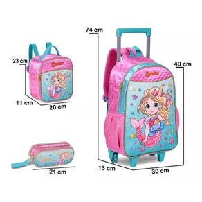 Kit Mochila de Carrinho,Lancheira e Estojo 16 Clio Style O Kit Escolar que vai transformar o dia a dia na escola em uma experiência mágica,um kit mais meigo e fofo do mundo, chegou diretamente da realeza para apaixonar as meninas O kit contém: -01 Mochila com amplo compartimento principal, com espaço para livros, apostilas, cadernos e muita coisa Contém um puxador retrátil e duas rodinhas que facilitam a locomoção da criança. Os bolsos laterais são ideais para as garrafinhas. -01 Estojo com 2 compartimentos para manter lápis, canetas e demais acessórios organizados. -01 lancheira com forro impermeável e Térmico, para que os alimentos se mantenham sempre preservados. Especificações: -marca: Clio Style -tema: Sereia -cor Predominante: Azul e Rosa -dimensões da Mochila: 40x13x30cm -dimensões do Estojo: 21cm de comprimento -dimensões da Lancheira: 23x11x20cm : 3 Meses Validade: Indeterminada