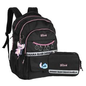 Ohana nas Costas e Material Organizado! Kit Stitch de Costas PRETO: Estilo Moderno e Organização Garantida! Para os fãs do Stitch que preferem o modelo de alças e um visual mais escuro, este Kit de 2 Peças Oficial é a escolha ideal! O conjunto coordenado em Preto com detalhes vibrantes em Pink destaca o tema "Ohana Quer Dizer Família".