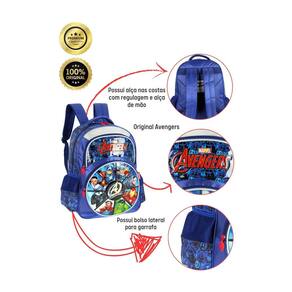 Kit Escolar Mochila De Costas+Lancheira Térmica Avengers Mochila de Costas: Confeccionada em Poliester Logo personalizado Puxadores personalizados Possui 3 compartimentos com fechamento em zíper Possui 2 bolsos laterais para garrafa Alças de costas reguláveis e acholchoadas e alça de mão