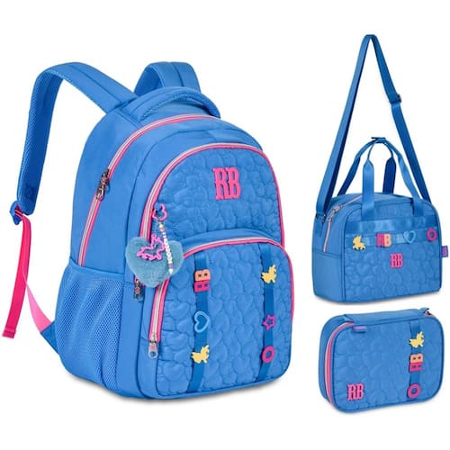 Confeccionadas em material soft texturizado com matelassê personalizado, cadarço acetinado com passadores que se movem. Mochilas com chaveiro de pompom de coração, mascote em plástico vazado e miçangas.