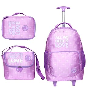 Kit Mochila de Rodinha Bolsa Estojo e Lancheira Coração Este lindo kit de mochila de rodinhas infantil feminina é perfeito para acompanhar as pequenas em todas as aventuras escolares e do dia a dia. Com um design encantador cheio de corações, este conjunto une praticidade, conforto e estilo. Características da Mochila: Versatilidade: Conta com rodinhas resistentes para facilitar o transporte e alças de costas acolchoadas e ajustáveis para maior conforto. Funcionalidade: Possui uma alça de mão prática e um compartimento principal espaçoso com uma divisão interna para manter tudo organizado. Bolsos Práticos: Um bolso externo com zíper para acesso rápido a itens essenciais e bolsos laterais perfeitos para garrafinhas ou pequenos objetos. Detalhes Encantadores: Os puxadores de zíper em formato de coração combinam perfeitamente com a estampa cheia de coraçõezinhos, tornando o kit ainda mais fofo. Dimensões: 42 cm de altura x 30 cm de largura x 18 cm de profundidade. Capacidade: 25 litros. Lancheira: Mantém os lanchinhos sempre organizados e acessíveis. Dimensões: 23 cm de altura x 17 cm de largura x 15 cm de profundidade. Estojo: Ideal para guardar lápis, canetas e outros materiais escolares. Dimensões: 23,5 cm de altura x 16 cm de largura x 6,8 cm de profundidade. Cuidados com o Produto: Evite carregar excesso de peso para preservar a estrutura da mochila. Não insira objetos pontiagudos ou cortantes para evitar danos ao material. Para limpeza, utilize apenas um pano úmido com sabão neutro; não use abrasivos ou solventes químicos. Com este kit incrível, as crianças vão adorar organizar seus materiais com estilo e praticidade. Um presente perfeito para acompanhar o dia a dia com conforto e diversão Marca: Não Informado