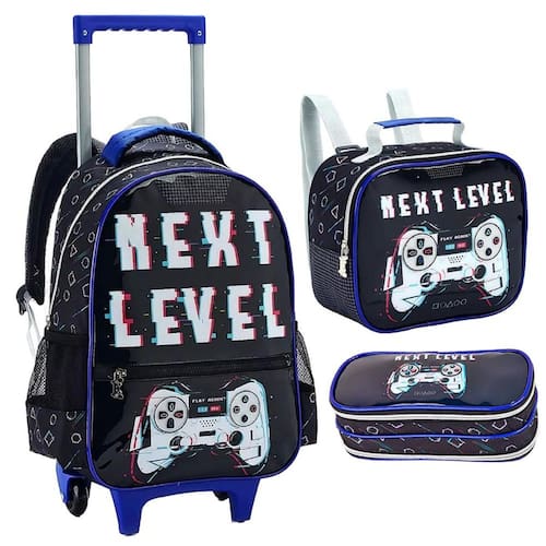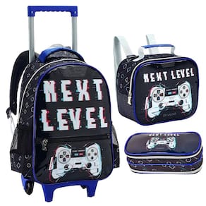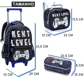 Transforme o dia a dia escolar em uma verdadeira aventura com o kit de mochila de rodinhas Next Level Inspirado no universo dos videogames, este kit é perfeito para meninos que amam tecnologia, desafios e diversão. Com cores predominantes em azul e preto, o design é moderno, vibrante e cheio de atitude. Características da Mochila com Rodas: Design Gamer: Estampa Next Level com elementos gráficos que remetem ao universo dos jogos eletrônicos, ideal para quem ama videogames. Mobilidade e Conforto: Duas rodas de silicone resistentes, proporcionando deslocamento suave e silencioso. Alça de mão prática para maior versatilidade. Alça de Ombro acolchoadas e ajustáveis Organização Perfeita: Compartimento principal amplo para acomodar cadernos, livros e materiais escolares. Bolso frontal com zíper para guardar itens menores com facilidade. Dois bolsos laterais ideais para garrafas ou outros acessórios. Capacidade: Suporta até 18 litros. Dimensões: 41,5 cm de altura x 29 cm de largura x 13 cm de profundidade. Características da Lancheira: Térmica e Funcional: Mantém os alimentos frescos e prontos para o consumo. Praticidade no Transporte: Alças de ombro ajustáveis e alça de mão ergonômica, atendendo a diferentes necessidades. Divisão Única: Espaçosa e ideal para organizar os lanches. Características do Estojo: Compacto e Prático: Uma divisória para lápis, canetas e acessórios escolares. Dimensões: 22,5 cm de comprimento x 8 cm de altura. Por que escolher este kit Estilo Exclusivo: A estampa Next Level é perfeita para jovens gamers que desejam expressar sua paixão por jogos eletrônicos. Qualidade e Funcionalidade: Materiais duráveis, organização eficiente e recursos que tornam o transporte mais prático. Cores Modernas: A combinação de azul e preto traz um toque contemporâneo e descolado. Prepare-se para vencer no jogo da rotina escolar Com o kit Next Level, cada dia será uma nova fase cheia de organização, conforto e estilo Marca: Klizz