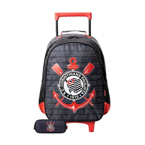 Mochila Rodinha G Escolar Corinthians: Possui RODAS RESISTENTES Confeccionada em Poliéster e PVC Possui 1 compartimentos espaçosos Fechamento em zíper REFORÇADO Dois bolsos laterais telados pra garrafa Regulador de tamanho da alça na parte traseira Puxadores personalizados Medidas: Altura: 40 cm Largura: 30 cm Profundidade: 15 cm