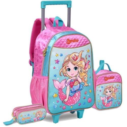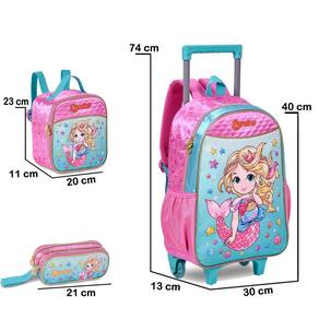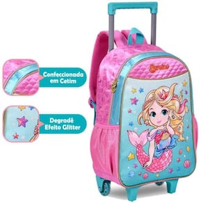 kit Mochila Mochilete Sereia Encanto Dos Mares Infantil Escolar 2 em 1 Alças e Rodinhas Tamanho Grande Com Lancheira Térmica Com Garrafinha Potinho e Estojo Duplo A Mochila com Rodinhas Sereia Encanto com a Sereia mais horripilantes vão dar asas a sua imaginação e também a sua Mochila Produzida em Cetim, material brilhante e com toque macio.Possui carrinho em alumínio com alça articulada, deixando a Mochilete mais leve, facilitando o transporte para adultos e crianças. Bolso frontal em cetim com aplicação de glitter, bolsos laterais com elástico para deixar seus objetos favoritos sempre à mão, puxador e identificador no verso para colocar o seu nome. - Carrinho de Alumínio com alça articulada;- Bolso frontal em cetim com aplicação de glitter;- Bolsos laterais em Lycra;- Puxador Personalizado- Alças acolchoadas- Identificador no verso;- Material Principal Cetim;- Lancheira térmica com garrafinha e potinho- Medidas aproximadas mochila: Alt.40cm x Larg.30cm x Prof.15cm - Lancheira térmica com garrafinha e potinho - Medidas lancheira: Altura: 20cm x Largura:16cm x Profundidade:11cm - Estojo duplo