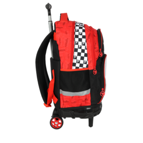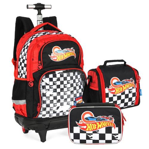 Mochila de Rodinha Hot Wheels Estampa oficial Hot Wheels com design xadrez e carros radicais. Rodinhas resistentes e alça retrátil em alumínio. Alças acolchoadas para usar também nas costas. Compartimentos espaçosos e bolsos laterais em tela.