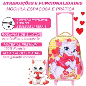 Prepare-se para encantar com o kit de mochila de rodinhas feminina Com uma charmosa estampa de listras, corações e uma adorável gatinha branca, o tema Cat Sweet é perfeito para meninas que amam estilo e fofura. Características da Mochila com Rodas: