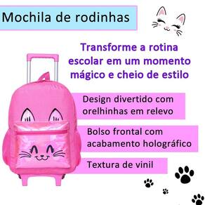 Este kit de mochila de rodinhas feminina é a combinação perfeita de encanto, praticidade e estilo Com um design encantador em rosa com glitter sutil, estampa fofa de gatinho e detalhes holográficos no bolso externo, ele é ideal para meninas que amam brilhar e se destacar. Características da Mochila: