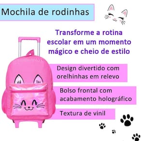 Este kit de mochila de rodinhas feminina é a combinação perfeita de encanto, praticidade e estilo Com um design encantador em rosa com glitter sutil, estampa fofa de gatinho e detalhes holográficos no bolso externo, ele é ideal para meninas que amam brilhar e se destacar. Características da Mochila: