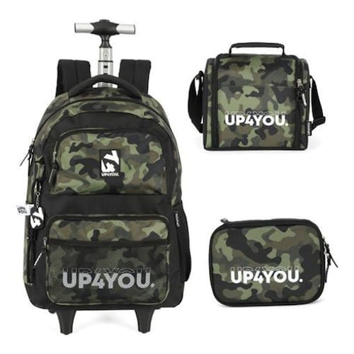 Conte com a facilidade das rodinhas , é muito mais fácil para sua filha o transportar a mochila, sem contar que já vem acompanhado com Lancheira e Estojo. Pode ter certeza que ela irá arrasar com este lindo Kit de Militar da Up4you Descrição da Mochila com rodinhas - Amplo compartimento principal para melhor organização dos cadernos, livros e apostilas; - 1 Compartimentos frontais com fechamento em zíper, para pequenos objetos; - Dispõe de alça de mão e alça retrátil reforçada para uma melhor locomoção; - Alças acolchoadas e reguláveis caso queira transportar no ombro; - Puxadores dos zíperes em borracha; - Possui puxador em formato T com 2 regulagens de altura. - Material: 100% Poliéster e forro 100% poliéster. - Chaveiro Personalizado - Detalhe telado no bolso frontal Tamanho/peso da Mochila: - Altura: 46 cm - Largura: 32 cm - Profundidade: 15 cm - Peso: 1,650 kg Lancheira Térmica; As lancheiras são leves, fáceis de limpar e transportar, combinam com qualquer criança e ainda cabem tudo que precisam para a hora do lanche. - Alça de mão e alças para carregar no ombro; - Fechamento em zíper - Altura: 23 cm - Largura: 20 cm - Profundidade: 15 cm - Peso: 200 gramas Obs.: Não acompanha potinho e garrafinha. Estojo; Lindo estojo com divisórias interna para melhor organização do seu material, ideal para o dia a dia na escola. - Altura: 6 cm - Largura: 22 cm - Profundidade: 15 cm de 6 meses contra defeitos de fabricação. Dicas e Cuidados; Proteja os objetos pontiagudos ou cortantes evitando o contato direto com o produto. Guarde o produto e um local seco, fresco e arejado, para evitar a proliferação de fungos que podem danificar o produto. Para Limpeza, use apenas água morna e sabão neutro nas partes metálicas somente uma flanela seca. Nunca aplique produtos abrasivos, solventes ou quaisquer agentes químicos. Para secagem, Utilize apenas pano seco. Não exponha ao sol e altas temperaturas por um período de tempo prolongado. Apare sempre os fios soltos do tecido, para que eles não se prendam no zíper. Duvida Faça-nos uma pergunta : Marca: Não Informado