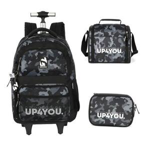 Conte com a facilidade das rodinhas , é muito mais fácil para sua filha o transportar a mochila, sem contar que já vem acompanhado com Lancheira e Estojo. Pode ter certeza que ela irá arrasar com este lindo Kit de Militar da Up4you Descrição da Mochila com rodinhas - Amplo compartimento principal para melhor organização dos cadernos, livros e apostilas; - 1 Compartimentos frontais com fechamento em zíper, para pequenos objetos; - Dispõe de alça de mão e alça retrátil reforçada para uma melhor locomoção; - Alças acolchoadas e reguláveis caso queira transportar no ombro; - Puxadores dos zíperes em borracha; - Possui puxador em formato T com 2 regulagens de altura. - Material: 100% Poliéster e forro 100% poliéster. - Chaveiro Personalizado - Detalhe telado no bolso frontal Tamanho/peso da Mochila: - Altura: 46 cm - Largura: 32 cm - Profundidade: 15 cm - Peso: 1,650 kg Lancheira Térmica; As lancheiras são leves, fáceis de limpar e transportar, combinam com qualquer criança e ainda cabem tudo que precisam para a hora do lanche. - Alça de mão e alças para carregar no ombro; - Fechamento em zíper - Altura: 23 cm - Largura: 20 cm - Profundidade: 15 cm - Peso: 200 gramas Obs.: Não acompanha potinho e garrafinha. Estojo; Lindo estojo com divisórias interna para melhor organização do seu material, ideal para o dia a dia na escola. - Altura: 6 cm - Largura: 22 cm - Profundidade: 15 cm de 6 meses contra defeitos de fabricação. Dicas e Cuidados; Proteja os objetos pontiagudos ou cortantes evitando o contato direto com o produto. Guarde o produto e um local seco, fresco e arejado, para evitar a proliferação de fungos que podem danificar o produto. Para Limpeza, use apenas água morna e sabão neutro nas partes metálicas somente uma flanela seca. Nunca aplique produtos abrasivos, solventes ou quaisquer agentes químicos. Para secagem, Utilize apenas pano seco. Não exponha ao sol e altas temperaturas por um período de tempo prolongado. Apare sempre os fios soltos do tecido, para que eles não se prendam no zíper. Duvida Faça-nos uma pergunta : Marca: Não Informado
