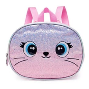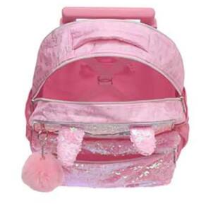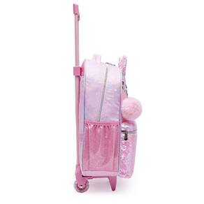 Coleção confeccionada em sarja fina de poliéster, com estampa corrida em foild dourado. Painel frontal com impressão transfer com gradiente em PU com glitter. Orelhas 3D em paetê costuradas no painel frontal. Puxadores de zíper de metal. Bolso frontal em lantejoulas reversíveis rosas iridescentes. Chaveiro com pompom no painel frontal. Patch de PU holográfico iridescente com logo em relevo. Etiqueta de identificação impressa no painel das costas. Conta também com uma lancheira toda personalizada da personagem, além de etiquetas personalizadas.