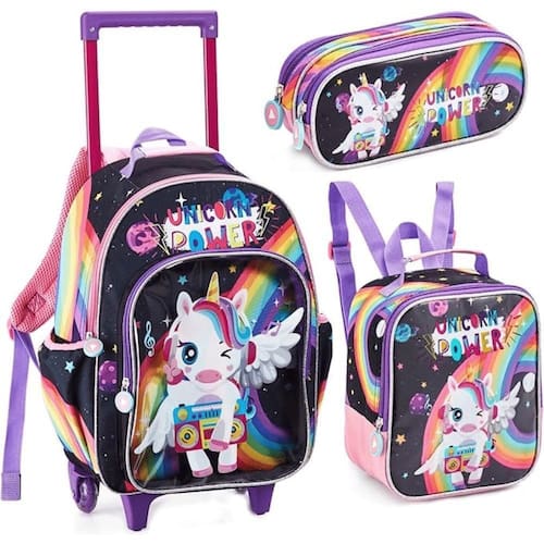 - 1 Mochila de Rodinhas Escolar Unicorn Power 25L DENLEX 1 Lancheira Térmica Escolar Unicorn Power 5L DENLEX 1 Estojo Duplo Escolar Unicorn Power DENLEX