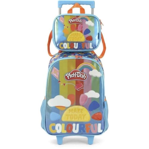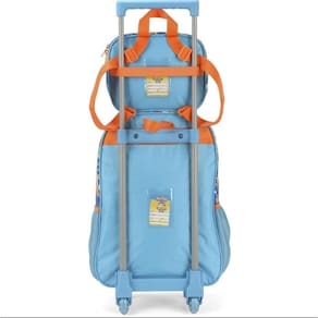 Kit mochila de rodinhas com bolsos laterais em tela com elástico, alças de costas espumadas e reguláveis, silk frontal, bolso frontal com zíper, alça de mão.