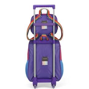 Kit mochila de rodinhas com bolsos laterais em tela com elástico, alças de costas espumadas e reguláveis, silk frontal, bolso frontal com zíper, alça de mão. Lancheira estampada com alça de costas e alça de mão, além de etiquetas personalizadas.