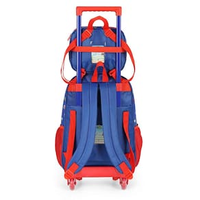 Kit mochila de rodinhas com bolsos laterias em tela com elástico, alças de costas espumadas e reguláveis, silk frontal, bolso frontal com zíper, alça de mão. Lancheira estampada com alça de costas e alça de mão, além de etiquetas personalizadas.