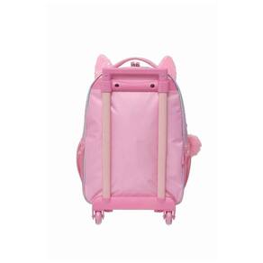 Coleção confeccionada em sarja fina de poliéster. Orelhas 3D em paetê costuradas no painel frontal. Puxadores de zíper de metal. Bolso frontal em lantejoulas reversíveis rosas iridescentes. Chaveiro com pompom no painel frontal. Conta também com uma lancheira toda personalizada da personagem, além de etiquetas personalizadas.