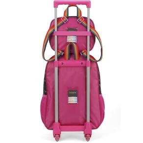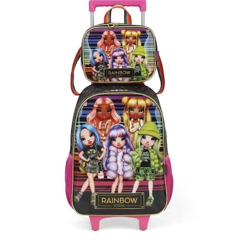 Kit mochila de rodinhas com bolsos laterais em tela com elástico, alças de costas espumadas e reguláveis, silk frontal, bolso frontal com zíper, alça de mão. Lancheira estampada com alça de costas e alça de mão, além de etiquetas personalizadas.