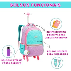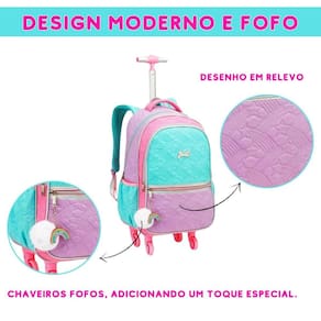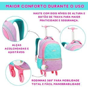 Este kit encantador é perfeito para as meninas que desejam praticidade e estilo no dia a dia. Composto por uma mochila de rodinhas, uma lancheira térmica e um estojo, o conjunto reúne funcionalidade, conforto e beleza. Mochila de Rodinhas A mochila de rodinhas foi projetada para oferecer máxima mobilidade e conforto: 4 rodinhas com giro 360: Proporcionam maior estabilidade e facilidade de manobra em qualquer direção. Haste ajustável com dois níveis de altura e botão de trava: Ideal para adaptar ao crescimento da criança e garantir conforto no transporte. Alças acolchoadas e ajustáveis: Para ser Utilizado como mochila tradicional. Alça de mão resistente: Para carregar com praticidade quando necessário. Amplo espaço interno: Possui um compartimento principal espaçoso para livros e materiais maiores. Compartimentos frontais: Um bolso maior e outro menor, perfeitos para objetos menores e fácil organização. Bolsos laterais: Ideais para carregar garrafas de água ou outros itens de acesso rápido. Design encantador: Nas cores azul, rosa e lilás que se mesclam harmoniosamente, com um lindo chaveiro de pompom e arco-íris, acrescentando charme e personalidade à mochila. Lancheira Térmica A lancheira térmica mantém os alimentos sempre frescos e organizados: Interior térmico: Garante a conservação dos lanches durante o transporte. Alça transversal ajustável: Facilita o uso cruzado, deixando as mãos livres. Alça de mão prática: Para um transporte rápido e seguro. Design coordenado: Combinando com a mochila, é perfeita para criar um conjunto harmonioso e estiloso. Estojo O estojo é o acessório indispensável para manter a organização dos materiais escolares: Tamanho ideal: Espaço suficiente para guardar lápis, canetas, borrachas e outros itens essenciais. Visual encantador: Nas mesmas cores e estilo do kit, complementa o conjunto com sofisticação e funcionalidade. Este kit combina praticidade, conforto e um design encantador para acompanhar as meninas em suas aventuras escolares e momentos especiais. Perfeito para quem busca organização e estilo em um só conjunto Marca: Não Informado Ean: 9532903209996