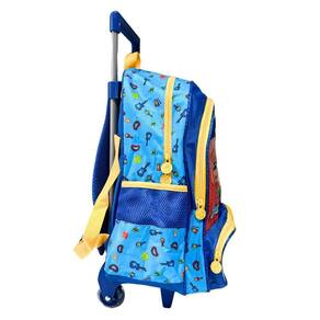 MOCHILA - A mochila é confeccionada em poliéster com painel frontal em PVC. - Possui bolso frontal em PVC texturizado e detalhes de apliques em PVC. - acompanha puxadores personalizados e bolso laterais com telado, ideal para garrafinhas e pequenos pertences. - Tem puxadores personalizados. - Possui alça de mão e alças acolchoadas reguláveis e confortáveis, carrinho embutido com rodinhas de silicone e apoio frontal. - Tamanho aproximado com a haste abaixada: 30cm largura x 40cm altura x 13cm profundidade