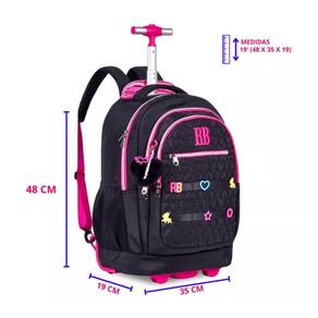 DIMENSÕES APROXIMADAS DA MOCHILA: -Altura (sem puxador): 50 cm; -Altura (com puxador): 98cm; -Comprimento: 35cm; -Largura: 25cm.